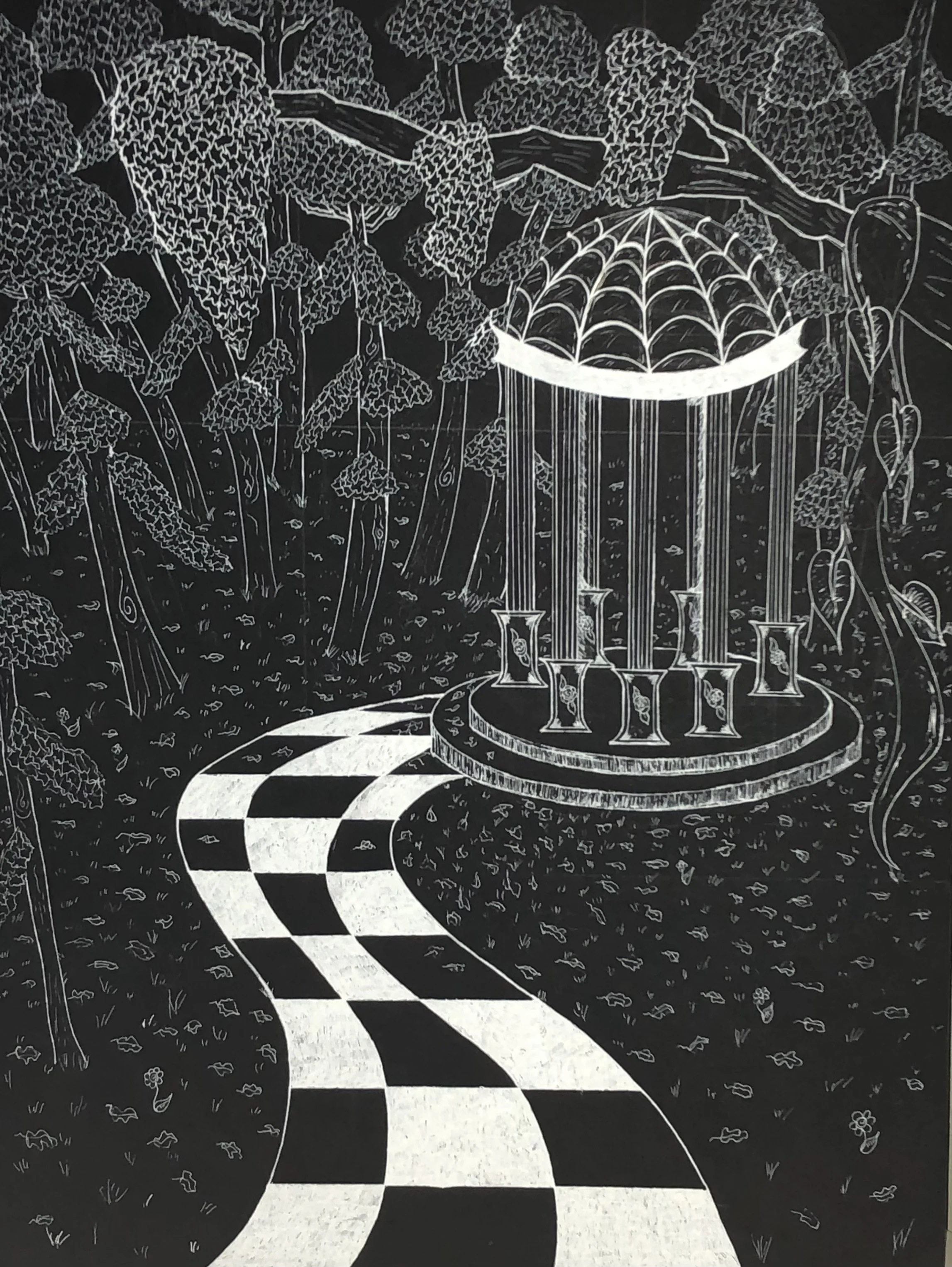 On your aimless journey you come across a pavilion in an ever growing forest, the hollow sounds of wind and the rustling of leaves has followed you. Something should be here but it isn’t, where am I?